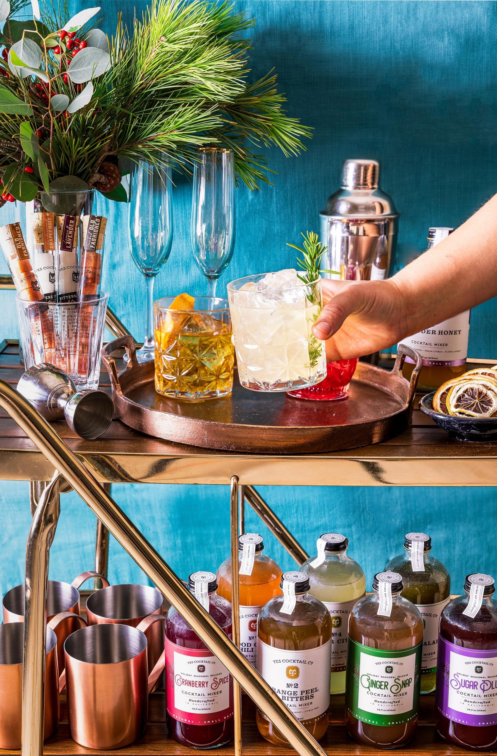 Our MYSTERY BOX includes 18 Yes Cocktail Co. Items, including Cucumber Jalapeno Cocktail Mixer, Lavender Honey Cocktail Mixer, Ginger Citrus Cocktail Mixer, Old Fashioned Bitters Infused Cubes, Dehydrated Orange Garnishes, Charred Oak & Maple Cocktail Syrup, and TEN mystery items!